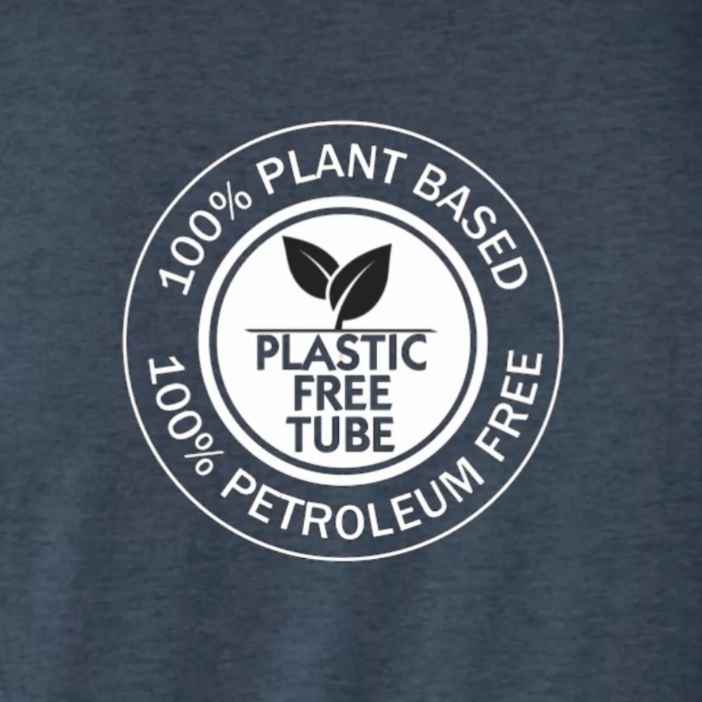The back features our bold “100% Plant Based, Plastic Free Tube, 100% Petroleum Free” badge—a conversation starter that shows support for environmental responsibility.